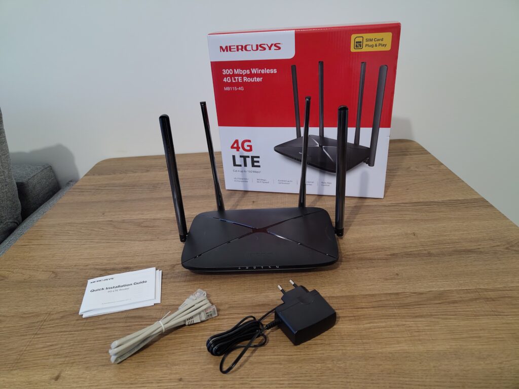 The router comes in an unremarkable generic box. Inside of it we find the router, along with the power supply, an RJ45 cable, and the user guide.