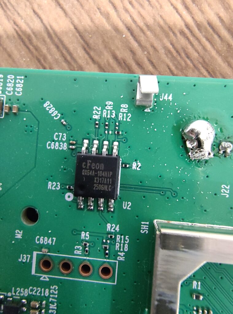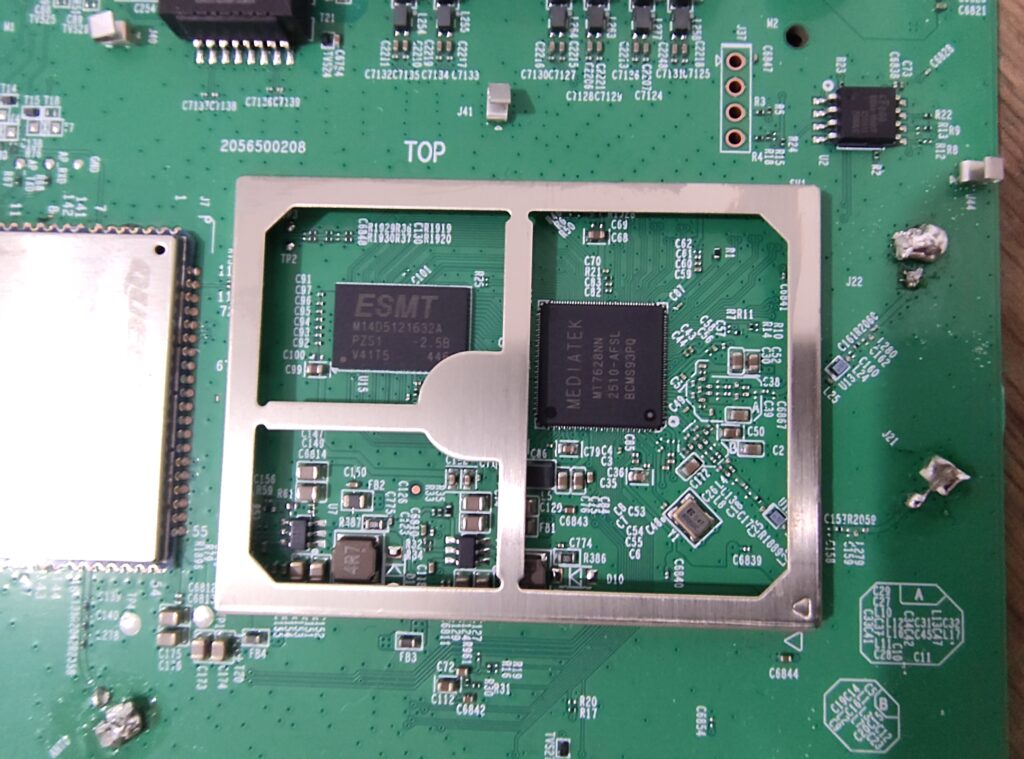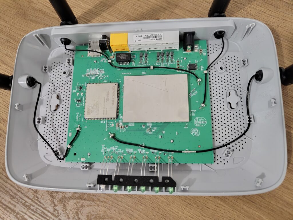 Inside of it, the modem is directly visible, while most of the components seem hidden underneath a metal RF shield. The router uses a Quectel EC200A-EL 4G modem. In the top right corner, we can see the small SPI flash chip.