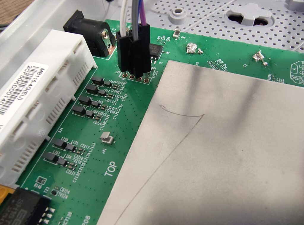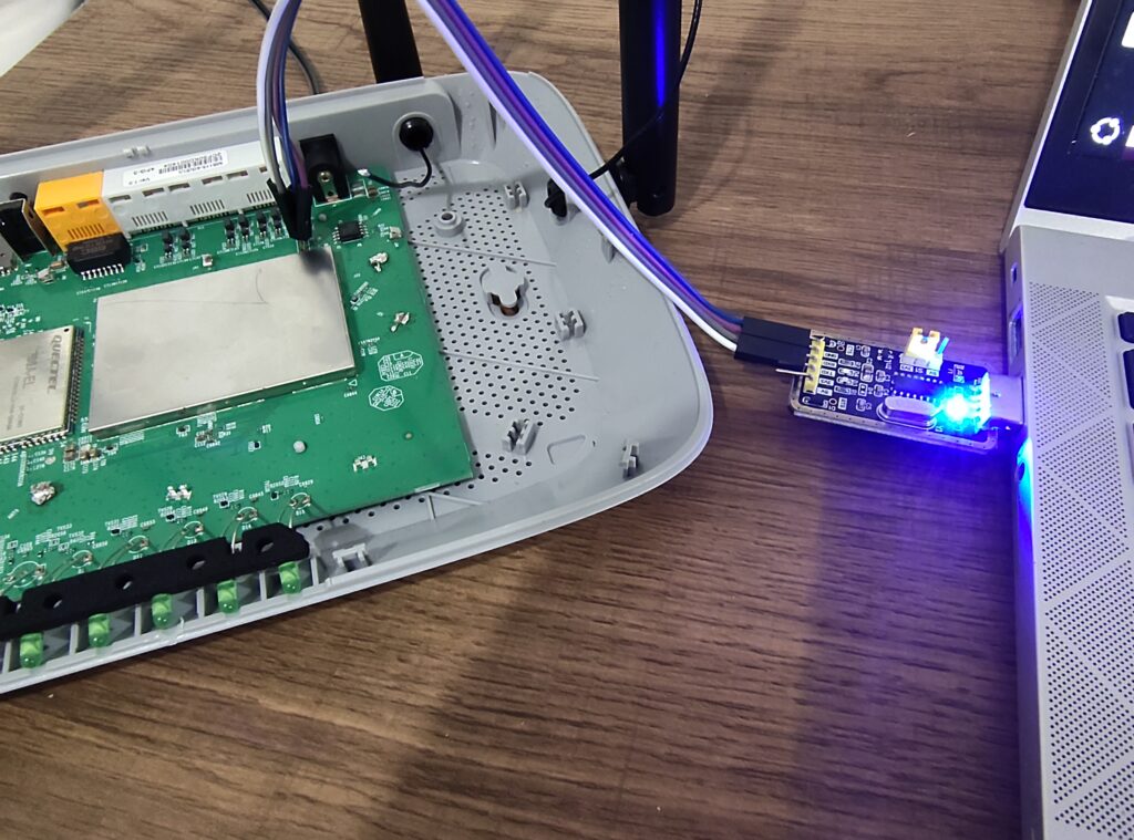 As you may have seen on the previous pictures, a UART header is also present next to the flash module. The pins are not labeled, therefore a multimeter is used to identify each pin. First, the multimeter is set in continuity mode, one lead is placed against any of the grounds (any metal chassis parts), and the other tested against each lead to find the GND. Then, the device is powered on. The 3V3 pin is at a constant 3.3 volts from the start, while the TX pin can be seen fluctuating for ~30 seconds before it stabilizes as the router is sending logs over this pin during boot. Finally, the RX pin is constantly at 0 volts. Then, a UART to USB module was used to connect using a laptop.