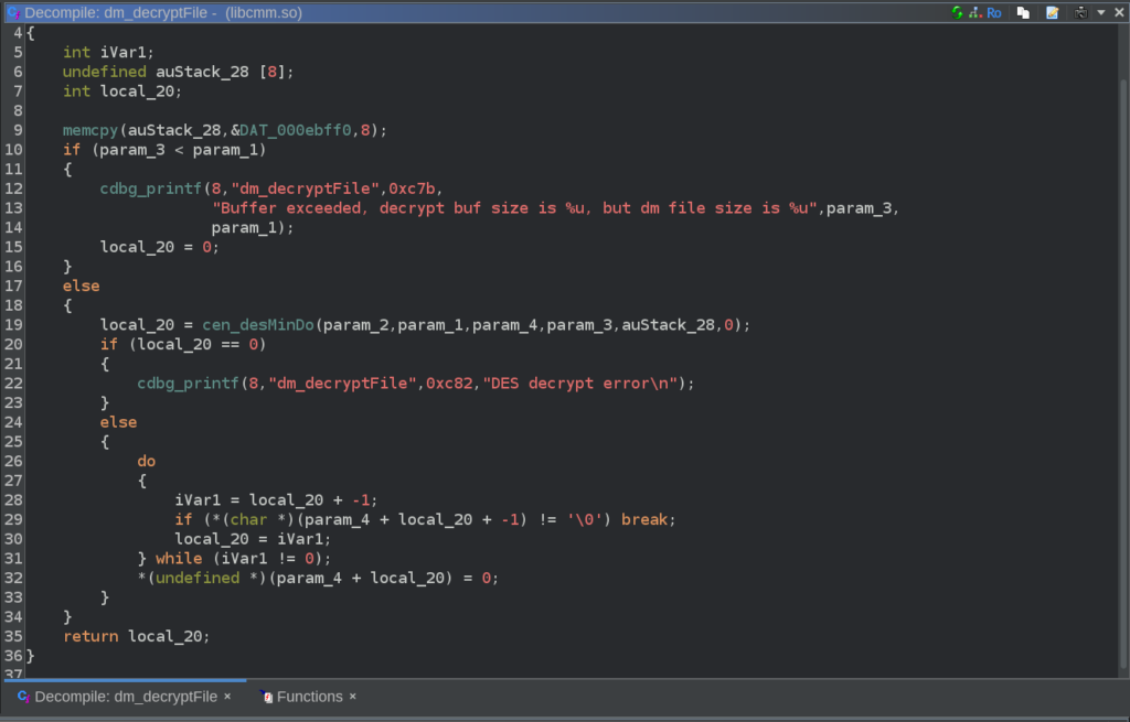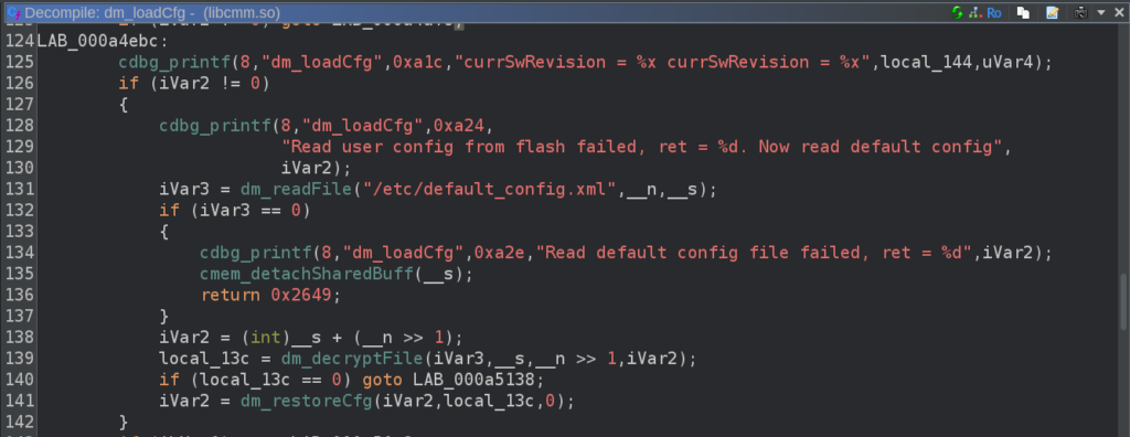 When searching for references to the encrypted XML files, I ended up reversing some of the code in libcmm.so and finding how exactly they are encrypted. When it loads the configuration, the library decrypts these files before parsing and using the XML contents. It turns out that this has already been done before on TP-Link routers (for example here). DES-ECB is used for the encryption, as can be seen in the decompilation: