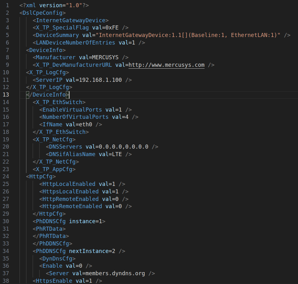 DAT_000ebff0 turned out to contain the 64-bit DES key, which can be directly used with openssl in ECB mode to decrypt the XML files. In default_config.xml, we find default configuration values for many features of the router. On the other side, reduced_data_model.xml contains the complete description of all the configuration objects manipulated by the router during use, which will be useful to understand their structure while searching for vulnerabilities later on.