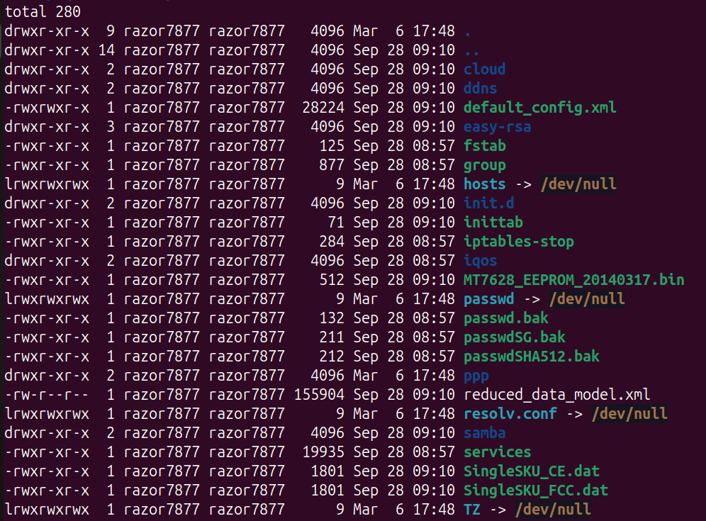 The /etc folder contains a lot of interesting information and configuration data for the router: